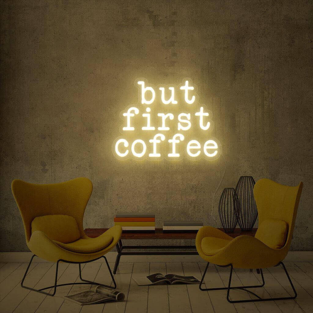 Der "but first coffee" Neon LED Schriftzug verleiht Deinen eigenen vier Wänden - egal ob Deinem Wohnzimmer, Schlafzimmer, Büro oder Gästezimmer - eine gemütliche und einzigartige Atmosphäre mit Wohlfühlfaktor.
