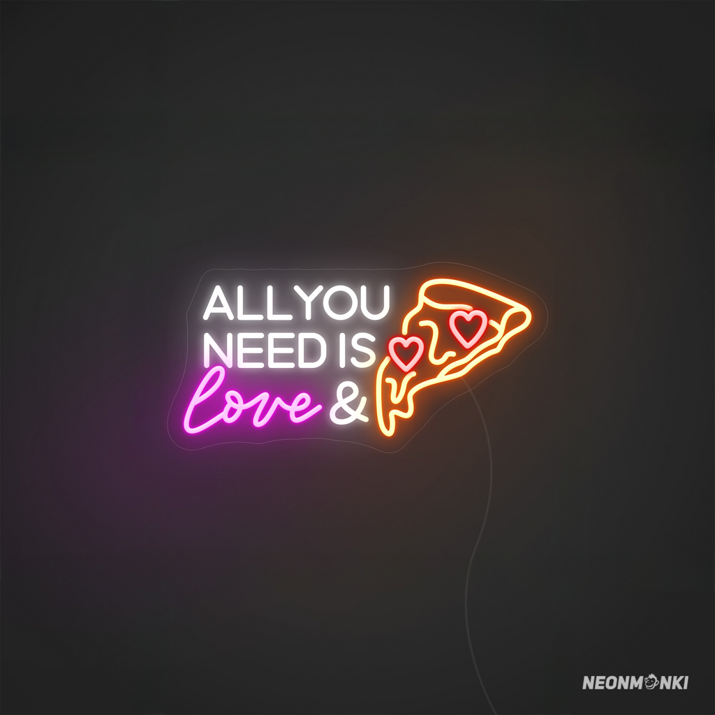 Setze ein Statement mit unserem handgefertigten Neon LED-Leuchtschild „All you need is love and pizza“ in den leuchtenden Farben Kaltweiß, Orange, Pink und Rot. Perfekt für Restaurants, Pizzerien, Foodtrucks oder als stilvolle Neon Wanddeko für deine Küche oder dein Wohnzimmer.