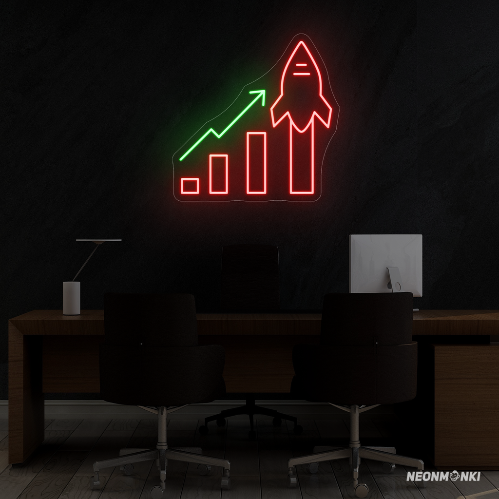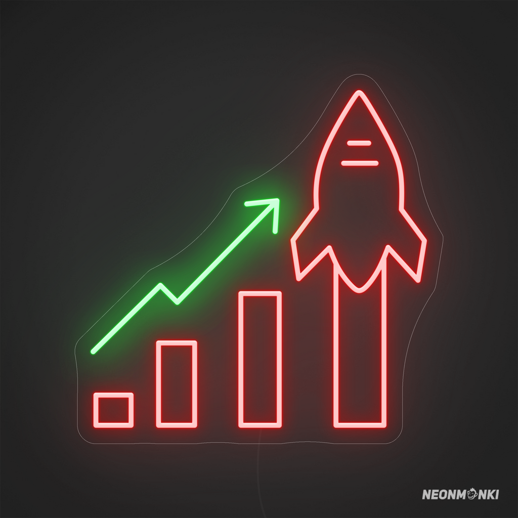Du liebst Fortschritt und willst ihn sichtbar machen? Unser handgefertigtes Neonschild im Design eines Balkendiagramms mit Rakete in den Farben Grün und Rot ist das perfekte Symbol für Wachstum, Aufbruch und Ambition. Als moderne Neon Wanddeko bringt es nicht nur Farbe, sondern auch Motivation in dein Büro, Homeoffice oder in den Verkaufsraum.