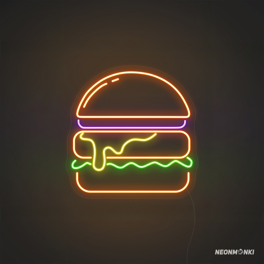 Mach dein Lokal zum Blickfang mit dem handgefertigten Neon LED Neonschild „Burger“ in den auffälligen Farben Orange, Lila, Gelb, Grün und Warmweiß. Dieses Leuchtschild bringt deine Burger-Spezialitäten perfekt zur Geltung – sei es im Restaurant, Imbiss oder als coole Neon Wanddeko für dein Streetfood-Konzept.