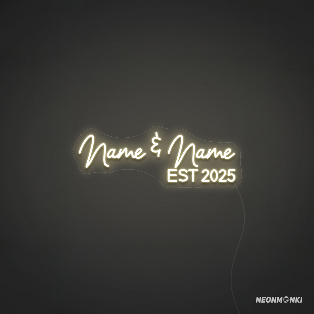 Mach Eure Liebe sichtbar mit einem personalisierten Neon LED Neonschild im Design "Name & Name EST 2025" – in elegantem Warmweiß. Dieses handgefertigte Neonlicht setzt nicht nur ein leuchtendes Statement auf Eurer Hochzeit, sondern bleibt als stilvolle Neon Wanddeko ein Symbol Eures besonderen Moments.