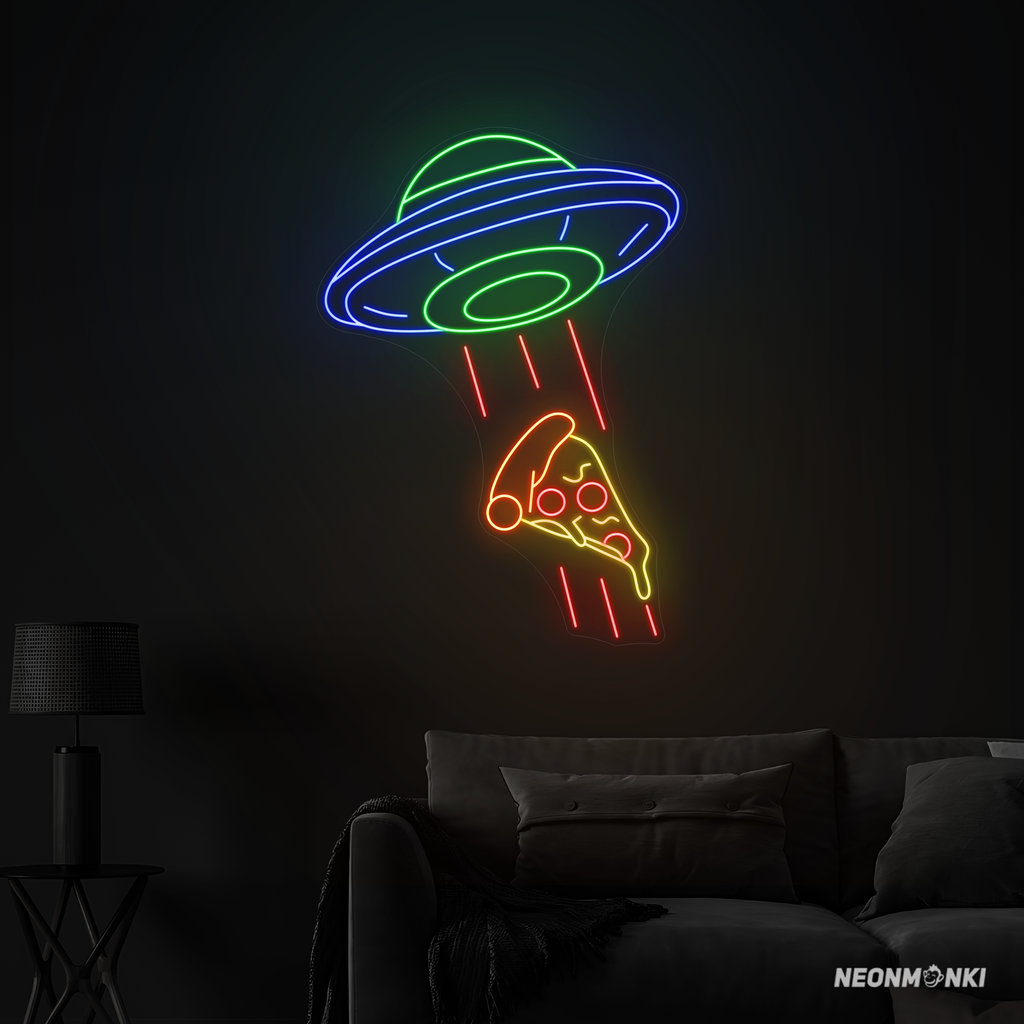 Dieses Design hebt ab – im wahrsten Sinne! Das handgefertigte Neon LED Schild zeigt ein detailverliebtes UFO, das ein Pizzastück aufbeamt, in leuchtenden Farben wie Grün, Blau, Rot, Orange und Gelb. Ein absoluter Eyecatcher für alle, die Humor, Popkultur und außergewöhnliche Neon Wanddeko lieben. Ideal für Küche, Gaming-Zimmer, Restaurants oder kreative Räume mit Charakter.