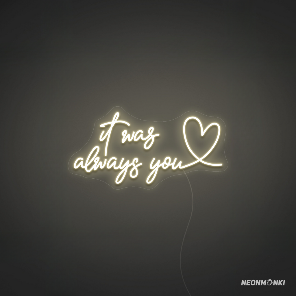 Setze ein emotionales Highlight mit dem Neon LED Wedding-Schriftzug "It Was Always You". Dieses stilvolle Neonschild bringt pure Romantik in deine Hochzeit, Verlobungsfeier oder als besondere Erinnerung in dein Zuhause. Mit seinem warmweißen Neonlicht erzeugt es eine elegante, gemütliche Atmosphäre und unterstreicht die Bedeutung dieses einzigartigen Moments.