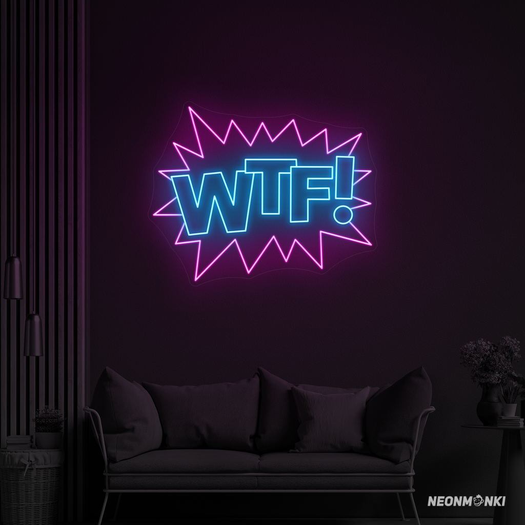 Du liebst klare Aussagen mit einem Augenzwinkern? Dann ist unser handgefertigtes Neon LED Schild „WTF!“ genau das Richtige für dein Interior. In leuchtendem Hellblau und Pink sorgt dieser LED Schriftzug für Gesprächsstoff – sei es als Neon Wanddeko im Wohnzimmer, Arbeitszimmer oder in kreativen Office-Spaces.