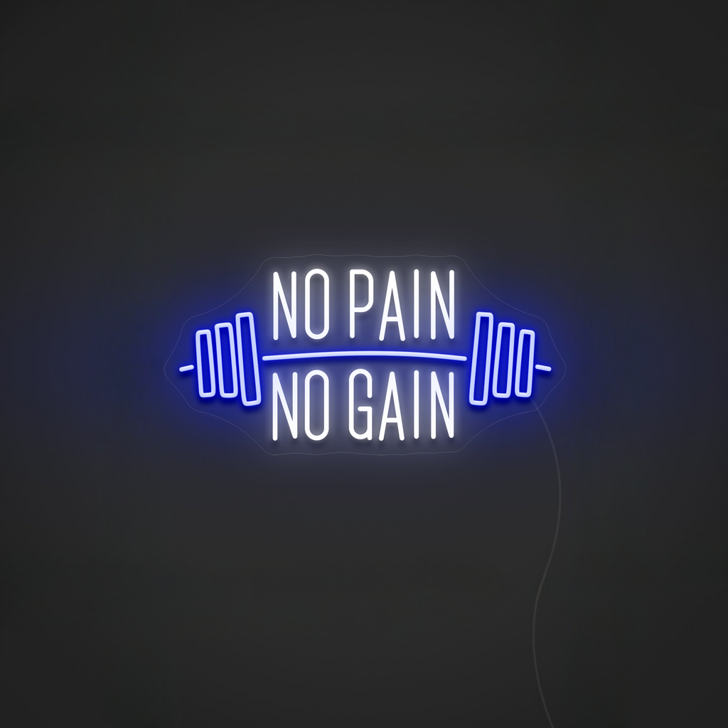 Motivation beginnt mit der richtigen Atmosphäre! Mit dem handgefertigten Neon LED Neonschild „No Pain No Gain“ in Kaltweiß und Blau setzt du ein klares Statement in deinem Fitnessraum. Das moderne Design mit Hantel-Symbol macht dieses Leuchtschild zum idealen Blickfang für jedes Gym, sei es zu Hause oder im Studio.