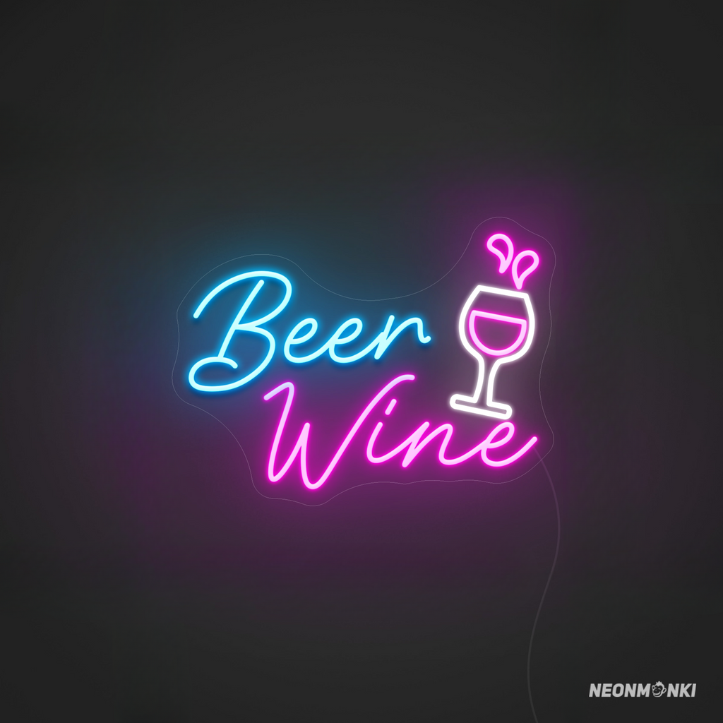 - Handgefertigtes Neon LED Schild mit "Beer Wine" Schriftzug und Weinglas-Motiv
