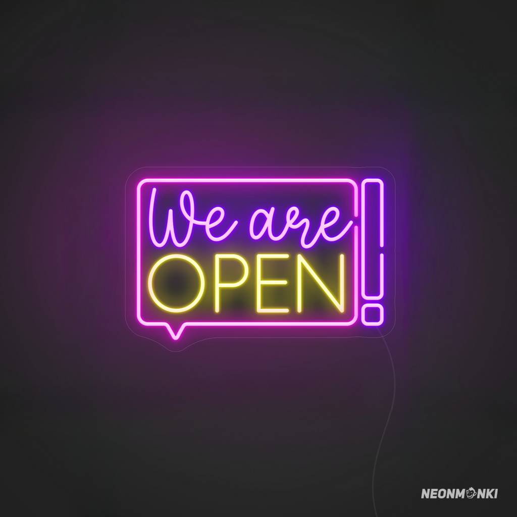 Strahlend einladend – Neon LED „We are OPEN!“ in Pink, Lila & Gelb für Deine Bar