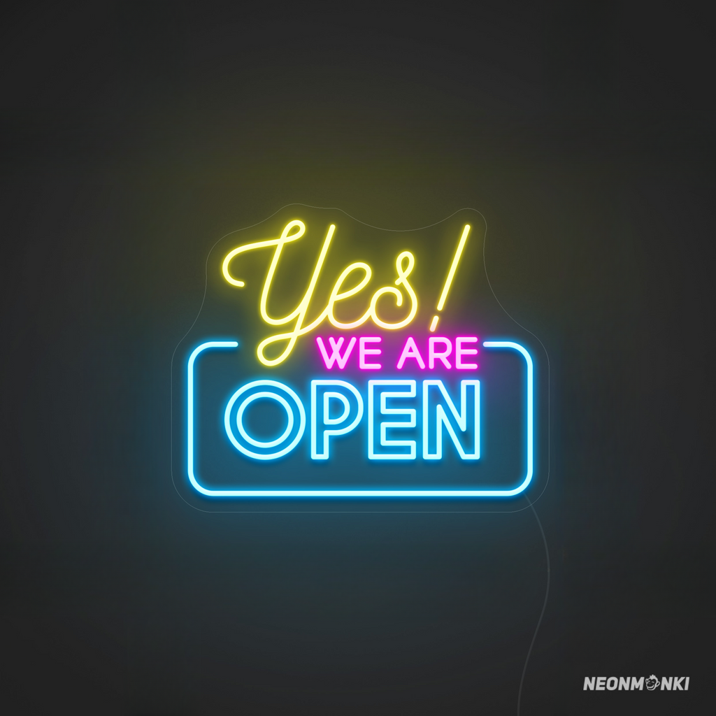 - Handgefertigtes LED Neonschild mit „Yes! We are OPEN“-Schriftzug